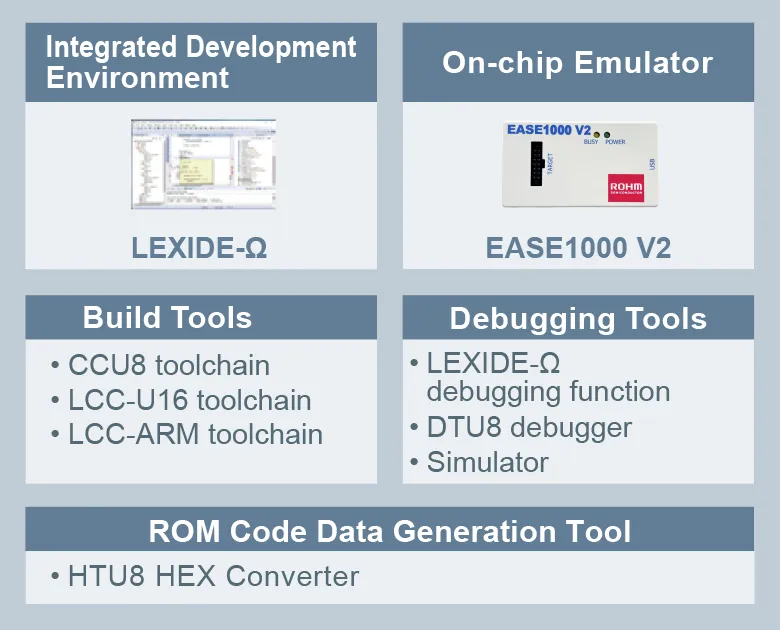 * EASE1000 V2 is compatible with microcontrollers equipped with LAPIS Technology 8-bit RISC processor and 16-bit RISC processor.