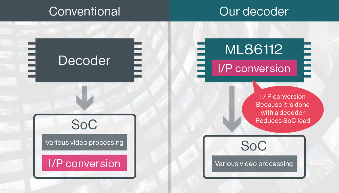 The I / P conversion function of the ML86112 outputs a progressive digital video signal to reduce the SoC load.