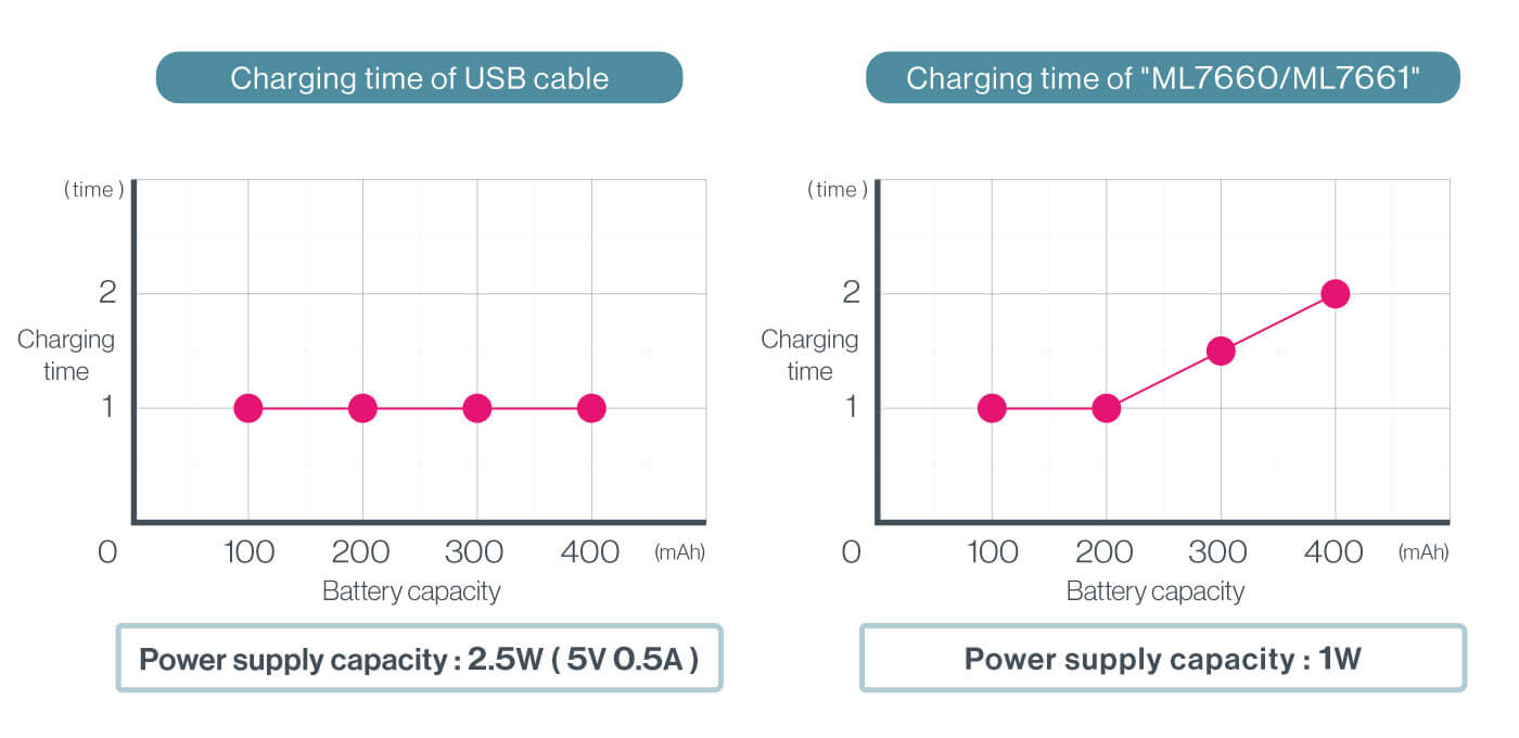 By increasing the power supply capacity to 1W(five times that of the conventional product),it is possible to charge wristband blood pressure monitors with large battery capacity, and to charge smartwatches and hearing aids at high speed