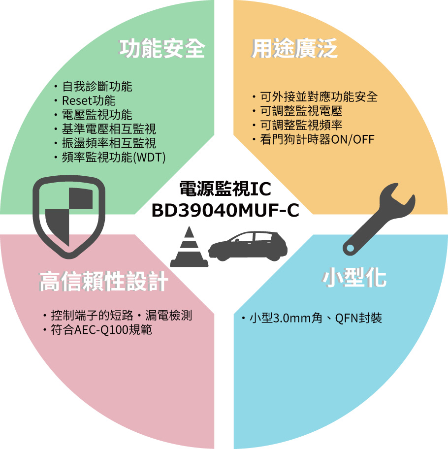 「BD39040MUF-C」是一款內建自我診斷功能的電源監控IC,具有以下特點,有助於建構ADAS、自動駕駛所需的功能安全系統。