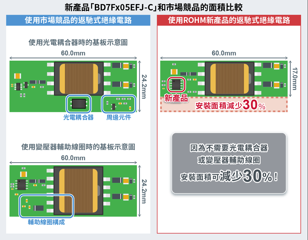 在主驅逆變器、OBC等隔離電路中,安裝面積比市場競品減少約30%
