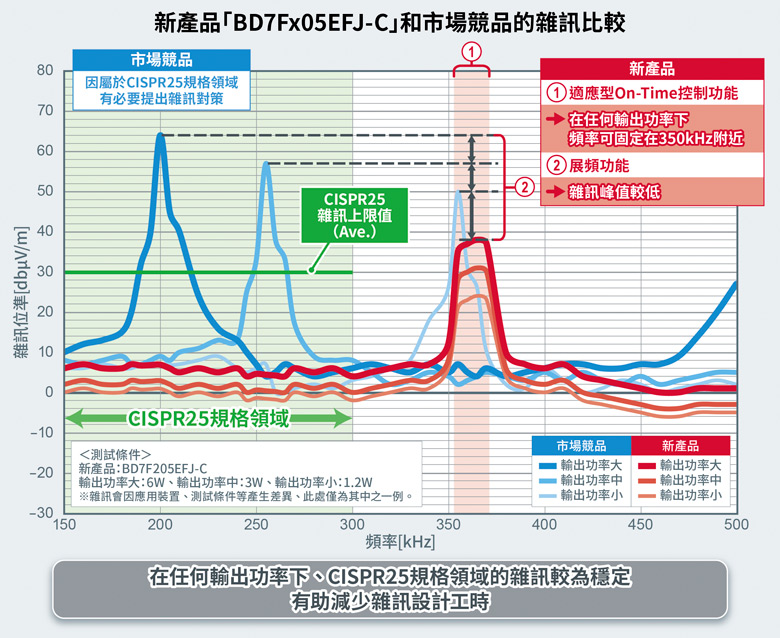 透過ROHM擅長的類比設計技術,在檢測二次側電壓和電流方面,新產品無需傳統產品所需的光電耦合器※3或變壓器輔助線圈以及週邊零件。因此可以在改善光電耦合器相關課題,如檢測精度受功耗大小和溫度的影響,或是年久老化等,同時減少元件數量來實現產品小型化。因此,與市場上的返馳式隔離電源電路相比,可以削減光電耦合器和用於檢測電流的週邊元件等10個零件,在電路板面積上,將能夠削減約30%的面積。此外由於新產品配備了自身調整導通時間控制功能,可以固定開關導通時間,所以無論是在哪種輸出功率狀態下,開關頻率都能穩定在350kHz左右。通常,在對應汽車電子電磁相容EMC標準CISPR25※4時,往往需要針對150kHz~300kHz頻段採取抗雜訊對策,本次的新產品因為沒有涉及到該頻段範圍,所以可簡化應用產品的抗雜訊對策。上述優勢加上有助降低輻射雜訊的展頻功能※5,將可進一步減少抗雜訊設計工時。