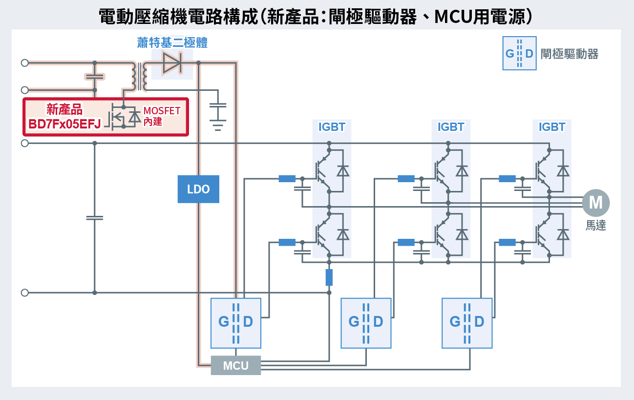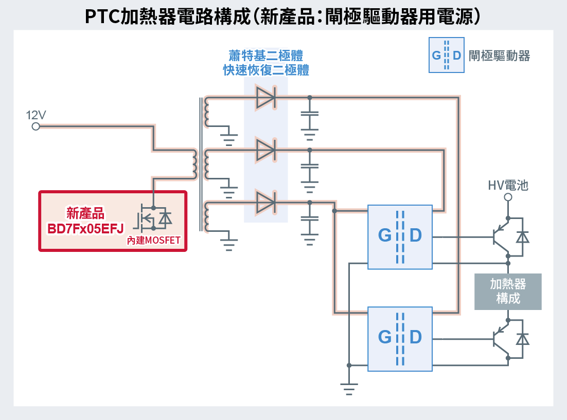 半導體製造商ROHM(總公司:日本京都市)推出二款隔離型返馳式※1DC/DC轉換器「BD7F105EFJ-C」和「BD7F205EFJ-C」,非常適用於xEV(電動車)的主驅逆變器、車載充電器(以下簡稱OBC)、電動壓縮機以及PTC加熱器※2等配備閘極驅動器的驅動電源。