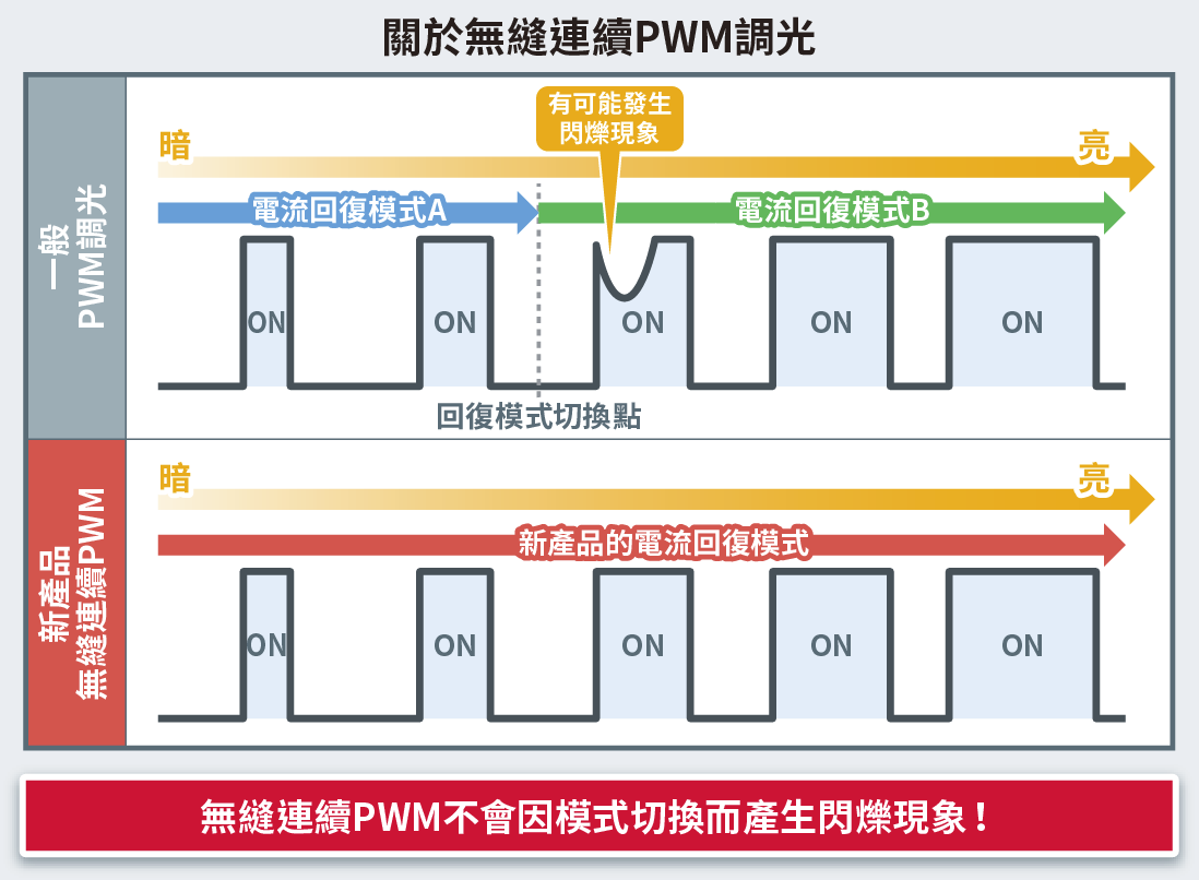 - 當LED以超高速度進行ON/OFF交替時,視覺上看起來就像LED處於持續點亮狀態。PWM調光就是基於該原理,透過調整亮燈時間(脈衝寬度)的長短,來調節LED明暗程度的調光方法。透過LED驅動器,進行開關的控制,來實現脈衝寬度的設定。因為該調光方式的明暗調整範圍較大,所以廣泛應用於液晶背光以及指示燈LED的亮度調節。但是根據其規格,仍有出現閃爍的風險。