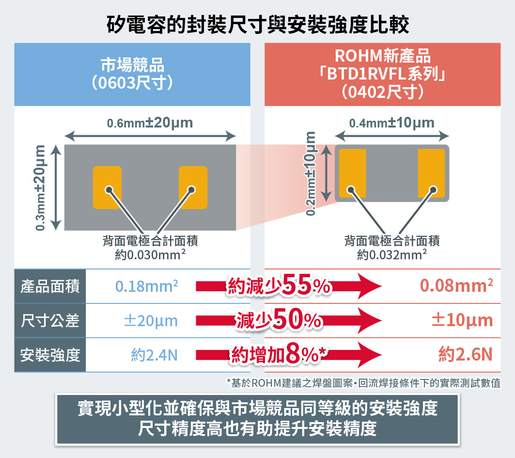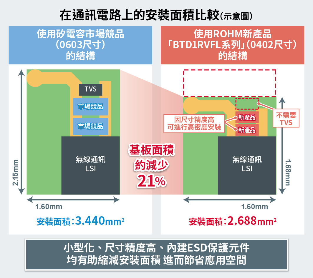 第一波產品「BTD1RVFL系列」的尺寸僅為0402(0.4mm×0.2mm),是業界最小尺寸的表面安裝型量產矽電容。與0603尺寸的市場競品相比,安裝面積減小約55%,僅為0.08mm2,非常有助應用產品小型化。另外新產品還內建TVS保護元件,可確保出色的ESD*2耐受能力,減少突波對策等電路設計工時。