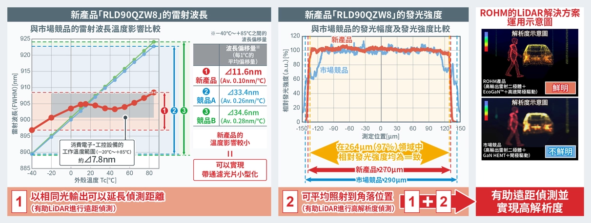 「RLD90QZW8」是針對使用3D ToF系統*2進行測距和空間識別的LiDAR應用所開發的一款120W高輸出功率紅外雷射二極體。利用ROHM獨家元件開發技術,與市場競品相比,新產品的雷射波長溫度影響減少了66%,僅為⊿11.6nm(平均0.10nm/℃)。該優勢有助實現帶通濾光片*3的小型化,進而有助LiDAR實現遠距離檢測。另外新產品還實現了270μm業界最小等級※的超窄發光幅度,而且在264μm範圍內(發光幅度的97%)實現了均勻而穩定的發光強度,有助提高LiDAR精度。此外新產品還實現了出色的光電轉換效率(PCE),光輸出的效率更高,有助降低LiDAR功耗。