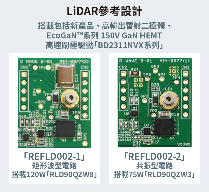 ROHM官網上提供搭載了新產品、ROHM開發的EcoGaN™系列150V GaN HEMT、以及高速閘極驅動器「BD2311NVX系列」的LiDAR用參考設計。
