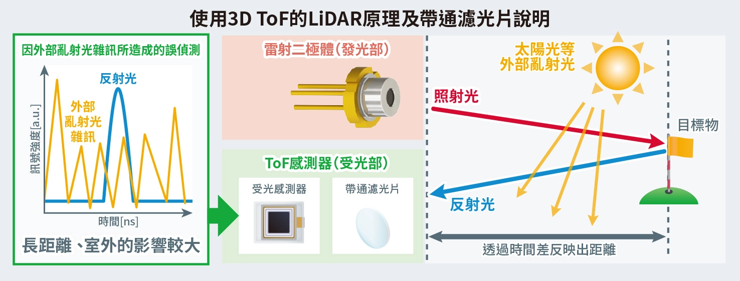 - 僅允許特定波長的光通過的濾光片。在光學元件中,如果帶通濾光片的通帶較窄,可以有效地僅擷取接近峰值波長的光,可大幅減少如陽光等外部環境光雜訊的干擾。若是在相同的偵測距離下功耗更低,在相同的光輸出功率下可延長偵測距離。