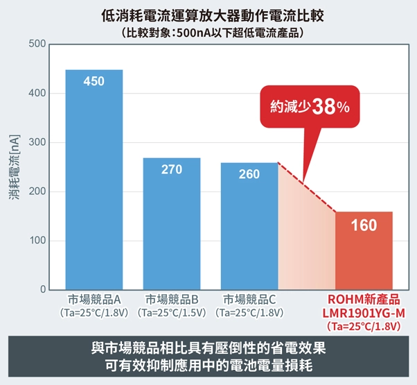 新產品採用ROHM獨家的超低消耗電流技術,徹底抑制了因溫度和電壓變化而導致的電流增加問題,與市場上的低消耗電流運算放大器相比,消耗電流減少約38%,僅為160nA(Typ.)。這不僅可延長由內建電池供電的電子貨架標籤等應用的使用壽命,還有助延長配備充電電池的智慧型手機等應用的續航時間。另外,在-40℃~+105℃的工作溫度範圍內,消耗電流幾乎不變,因此即使在火災報警器和環境感測器等外部溫度會發生變化的環境中,也能穩定進行省電運作。