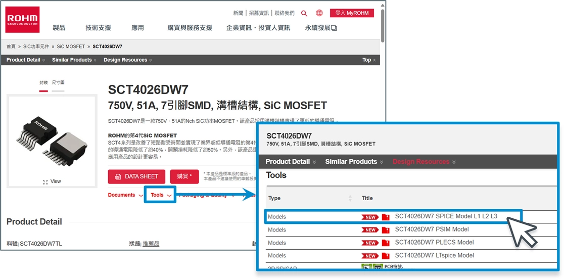 使用者可從第4代SiC MOSFET產品頁面的「設計模型」中進行下載