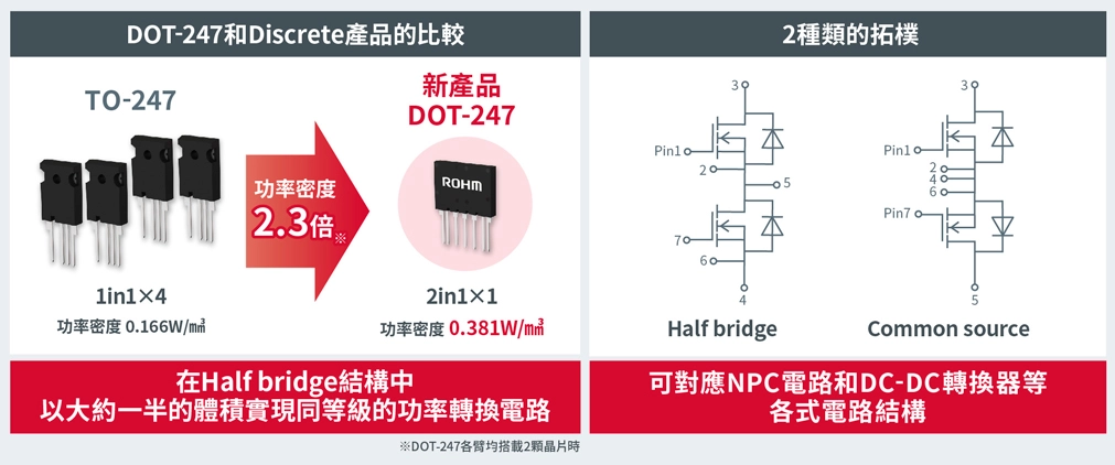 採用DOT-247的新產品有Half bridge和Common source等兩種拓撲結構,可對應NPC電路*2和DC-DC轉換器等多種電路配置。在上述配備多個Discrete元件的功率轉換電路中使用該產品,可以減少元件數量和安裝面積,助力實現應用產品小型化,並大幅削減安裝和設計工時。