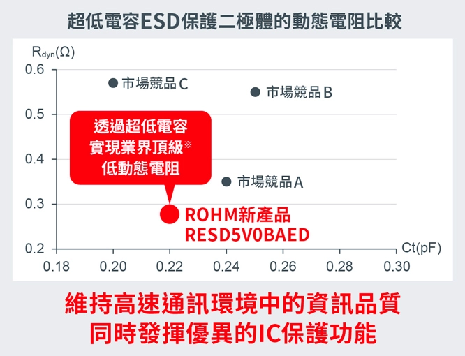 對此ROHM推出了能夠解決此課題、並支援更高速通訊的RESDxVx系列產品。新產品不僅實現更低電容,更實現更低的動態電阻。超過10Gbps的高速通訊介面,需要可將訊號劣化控制在更低、且具備出色IC保護性能的ESD保護二極體。新產品實現引腳間電容*3僅有0.24pF(雙向)和0.48pF(單向)的超低電容特性。同時與該特性難以兼顧的動態電阻也降低至0.28Ω。與市場競品相比,其鉗位元電壓*4降低了約40%,確保了優異的IC保護性能。