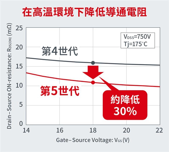 ROHM在開發第5世代SiC MOSFET的過程中,透過改進元件結構並優化製程,與之前的第4世代產品相比,成功將功率電子電路實際使用環境中備受重視的高溫工作時(Tj=175℃)導通電阻降低約30%(相同耐壓、相同晶片尺寸條件下比較)。在xEV牽引逆變器等需要在高溫環境下使用的應用中,該產品有助縮小單元體積,提高輸出功率。