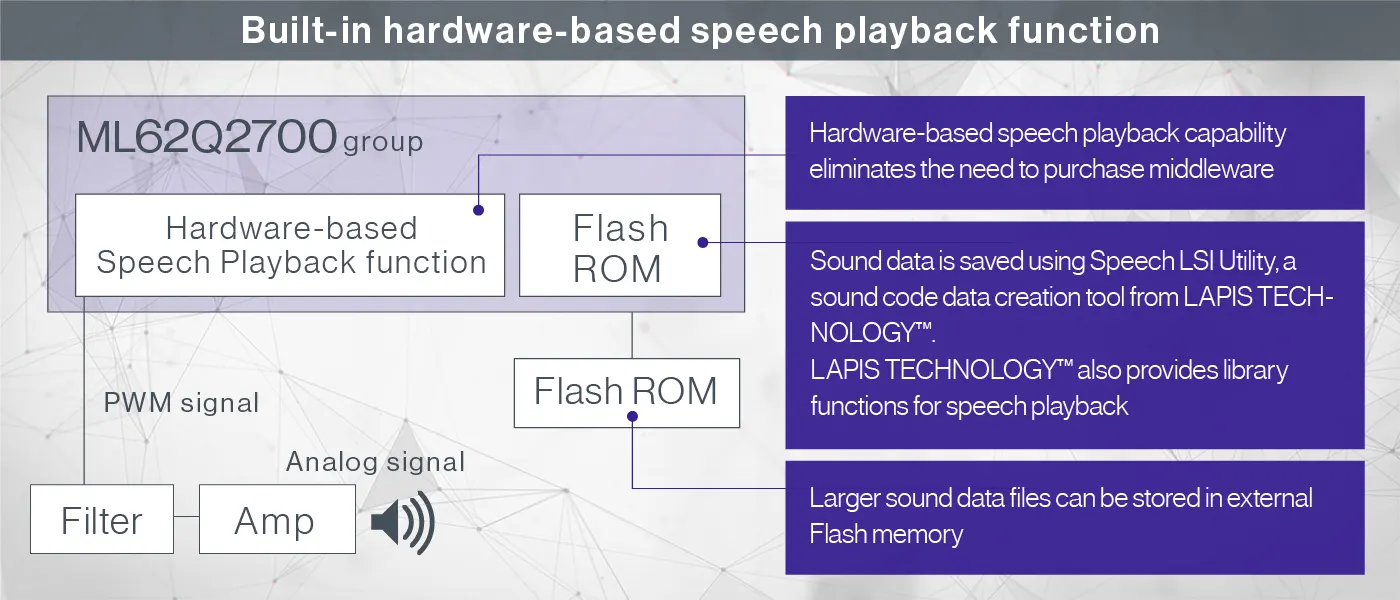 Feature 1Built-in hardware-based speech playback function facilitates speech playback without the need to purchase middleware.