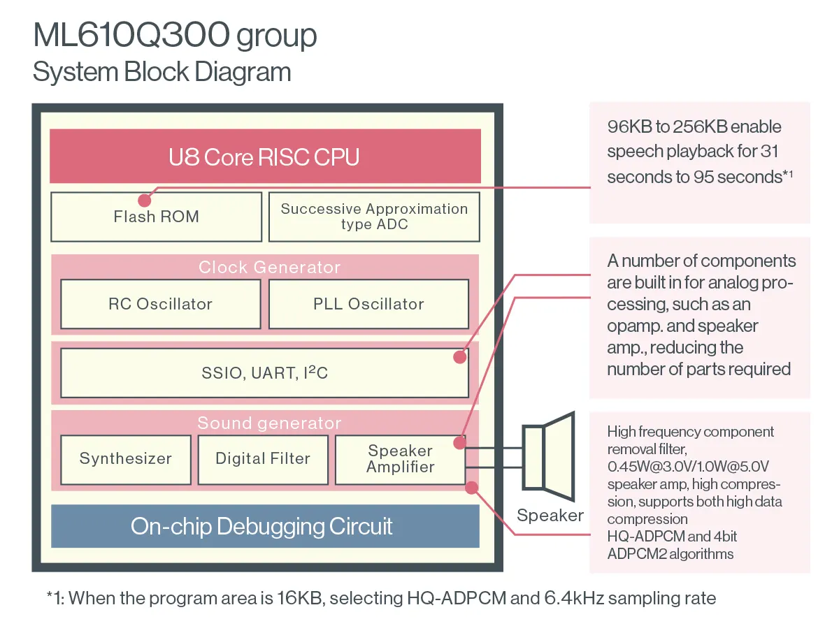 The ML610Q300 group integrates a high-quality speech playback function and a high-output speaker amplifier into a single chip and makes it easy to add speech o playback functions to your applications.