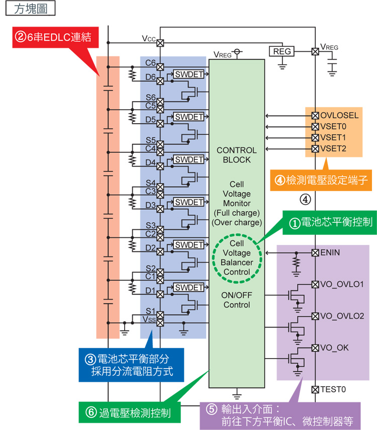 為了讓EDLC安全的發揮電芯平衡功能而搭載以下功能,外加符合車載國際品質標準AEC-Q100。
