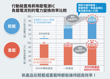 “BD83070GWL”是針對小型電池驅動的電子設備,以“低功耗環保元件的標準”為目標開發而成的超低功耗升降壓型電源IC。產品內建低損耗的MOSFET,並配置低耗電消耗電流電路,在各種電池驅動設備(電動牙刷以及刮鬚刀等)工作時(負載電流200mA時),功率轉換效率高達97%,而且,消耗電流僅為2.8µA,在升降壓型電源IC領域中也達到極高水準。因此,相比普通產品效率大大提升的應用在待機時(負載電流100µA時),電池續航時間可延長1.53倍(ROHM調查資料),非常有助於延長小型電池驅動的各種電子設備的續航時間。