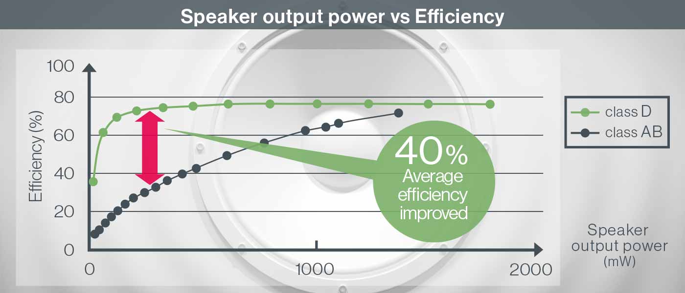 Class D speaker amps are capable of 1.0W (Max) output, feature low heat generation even at high (sound) volumes, and minimize heat dissipation measures.